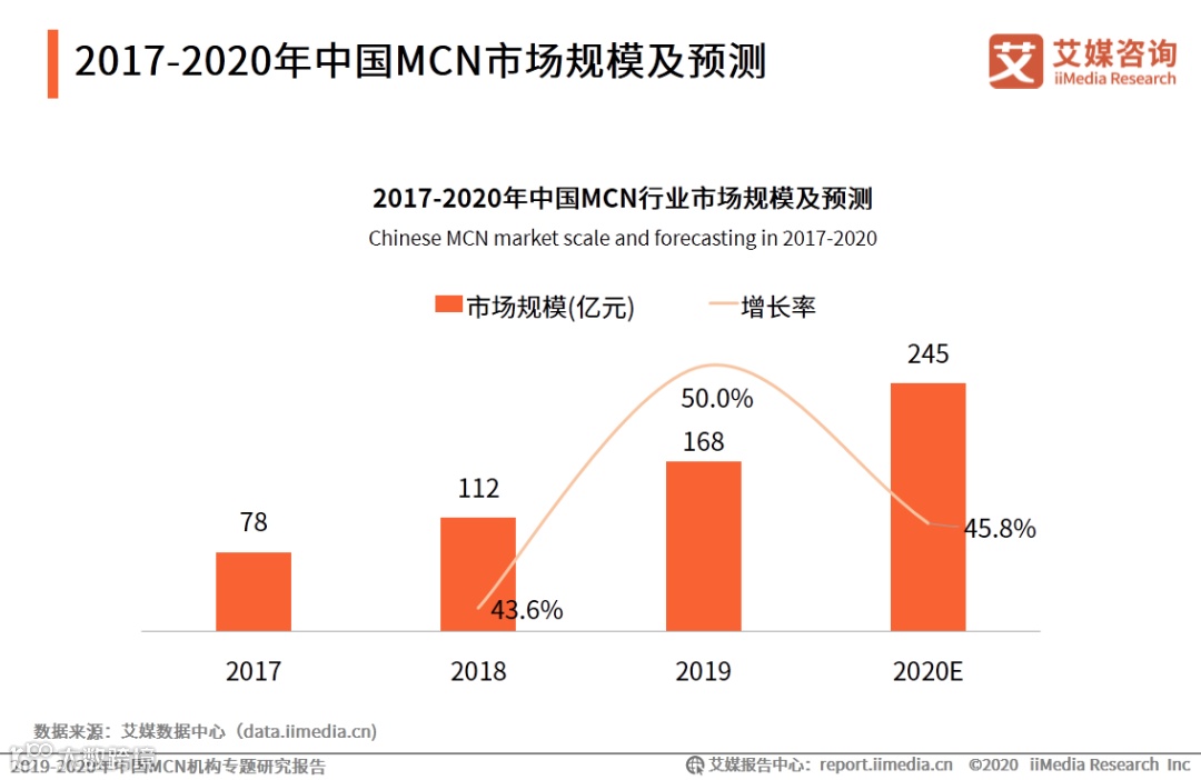 iiMedia Research(艾媒咨询)数据显示,2017年中国MCN市场规模为78亿元,预计2020年MCN市场规模将达到245亿元。艾媒咨询分析师认为,自2018年达到百亿级市场,MCN行业红利逐渐显现,市场规模不断扩大,较大的市场空间将吸引越来越多、越来越多样的机构、组织进入MCN市场。