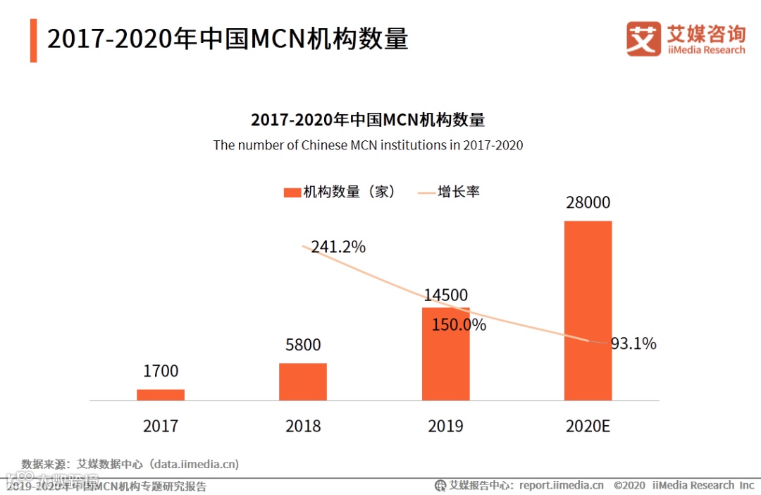 iiMedia Research(艾媒咨询)数据显示,2017年中国MCN机构数量为1700家,预计2020年MCN机构数量将达到28000家,平均同比增速大于100%。艾媒咨询分析师认为,中国MCN产业自2017年出现爆发式增长,MCN机构数量迅速增加,内容产业入局者越来越多,行业竞争将进一步加剧。