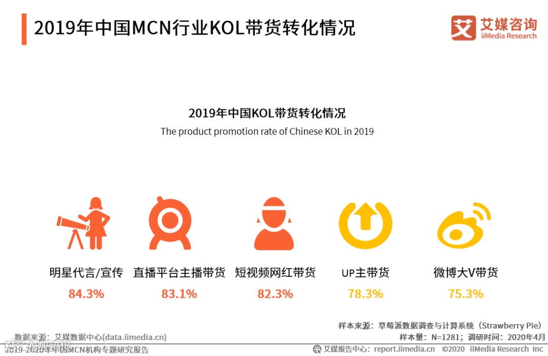 对于直播电商内容和形式而言,MCN机构有着更强、更广的变现能力,直播带货催生了MCN机构对于电商布局的加码,因此直播电商将成为MCN机构发展的重要方向。并且,根据iiMedia Research(艾媒咨询)数据,明星、直播平台主播和短视频网红带货转化率在80.0%以上,未来,MCN机构将吸引更多明星、网红参与直播带货。