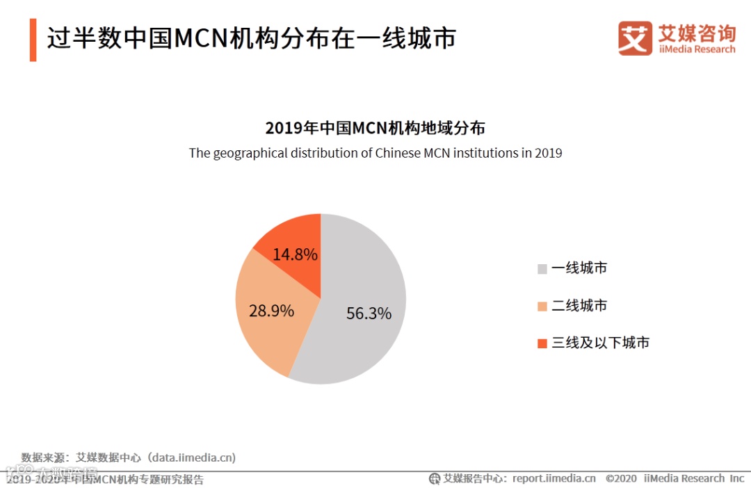 iiMedia Research(艾媒咨询)数据显示,56.3%中国MCN机构分布在一线城市,28.9%中国MCN机构分布在二线城市,14.8%中国MCN机构分布在三线及以下城市。艾媒咨询分析师认为,丰富的资源和多样化的受众是吸引MCN机构的主要因素。