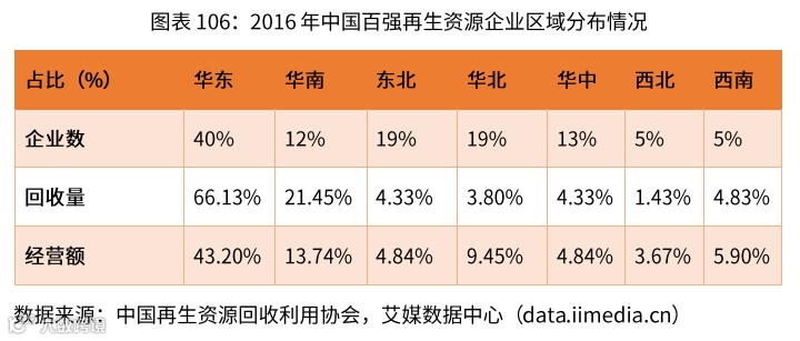 从地区分布来看,华东地区在再生资源行业中最具竞争优势;2017年,百强入榜企业中来自华东地区的占40%,经营规模占43.2%,回收量占66.13%;其次分别是华南、东北、华北、西南、华中、西北等地区。