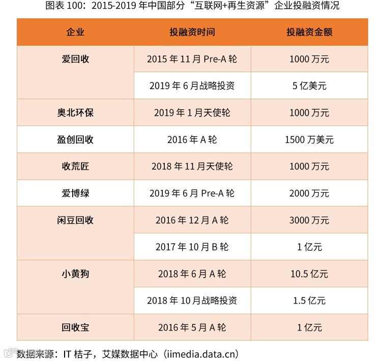 近年来,资本市场对“互联网+再生资源”行业看好,资金不断涌入。其中,爱回收、闲豆回收、小黄狗、回收宝等企业都获得亿元以上的融资规模。
