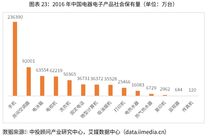 随着经济的高速发展和电器使用的普及,中国电器电子产品保有量迅猛增加,同时带动了电子废弃回收处理产业的发展。在2016年,在中国社会保有量最多的是手机产品,达23.6亿台;其次是房间空调,保有量达9.2亿台;电视机、冰箱、洗衣机保有量分别为6.2亿、6.4亿和5亿台。