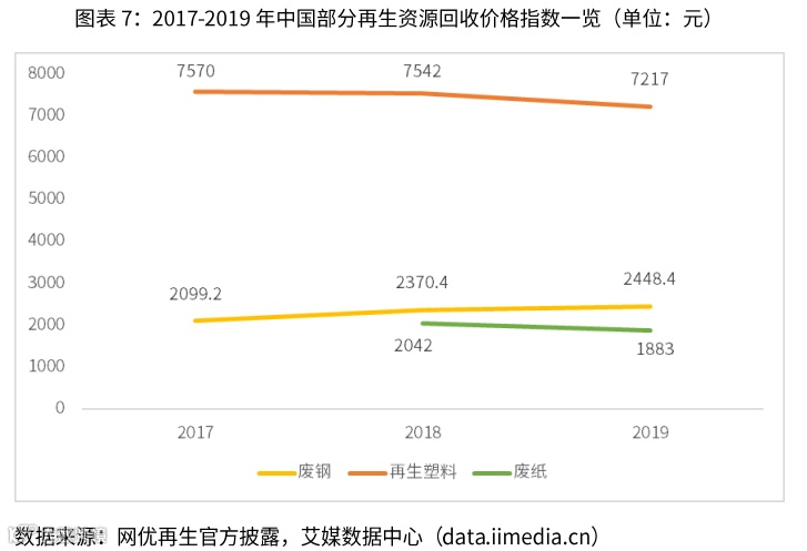 艾媒咨询数据显示,2017年至2019年10月15日,中国全国的废钢回收价格呈现增长态势,而再生塑料以及废纸的回收价格有所回落。艾媒咨询分析师认为,中国宏观经济保持稳定向好发展的态势,外需有望继续改善,因此钢铁、有色金属、纸、塑料等行业产品价格短期不会明显回落,未来再生资源整体价格上涨的可能性较大,再生资源回收企业实现盈利的可能性将进一步增加。