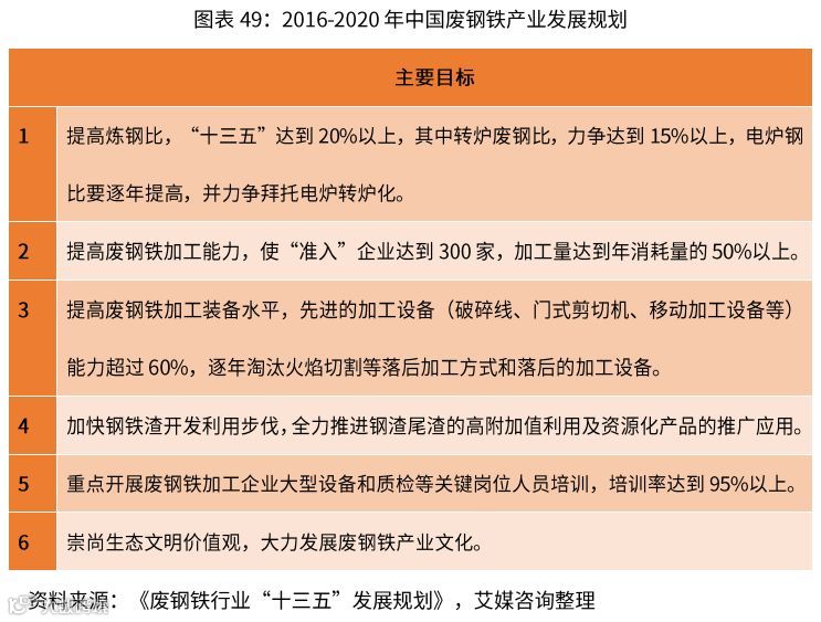 2016年12月,中国废钢协会发布《废钢铁行业“十三五”发展规划》,提出到十三五末,要将废钢比从十二五时期的10%提高到20%;其中,转炉废钢比要达到15%,电炉钢比要恢复到十一五末期12%的水平,以逐步摆脱电炉转炉化。未来,随着政府对行业继续加大扶持,中国的废钢再生资源回收利用率将会进一步提升,行业发展前景巨大。