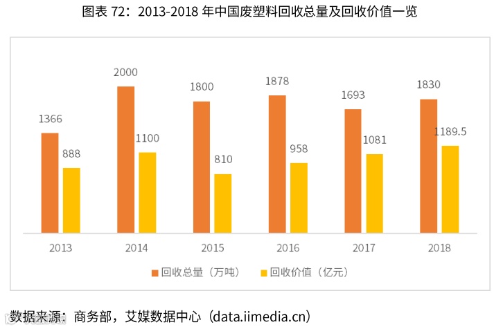 随着中国塑料工业的发展,塑料制品产量不断增多,加之居民以及各行业对于塑料制品的消费量极大,为废塑料的回收提供丰富的来源。但是近几年,由于中国塑料行业受环保及供给侧结构性改革等因素影响,塑料产品订单向大中型企业转移,小规模尤其家庭作坊式生产企业数量明显下降,导致废塑料回收量有所下降。但得益于废塑料市场供不应求现状,废塑料回收量开始回升,废塑料价格也持续走高,2018年,中国废塑料回收量为1830万吨,同比上升8.1%;废塑料回收总值为1189.5亿元,同比增长10%。