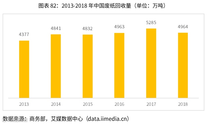 2009至2018年,中国废纸回收总量年均增长率约为3.4%;2018年,中国废纸回收总量为4964万吨,同比减少6.07%。