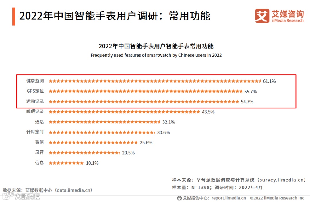 iiMedia Research(艾媒咨询)数据显示,在智能手表的众多功能中,健康数据监测是受访用户常用的功能,占比61.1%;其次,GPS定位和运动记录功能,分别占比55.7%和54.7%。