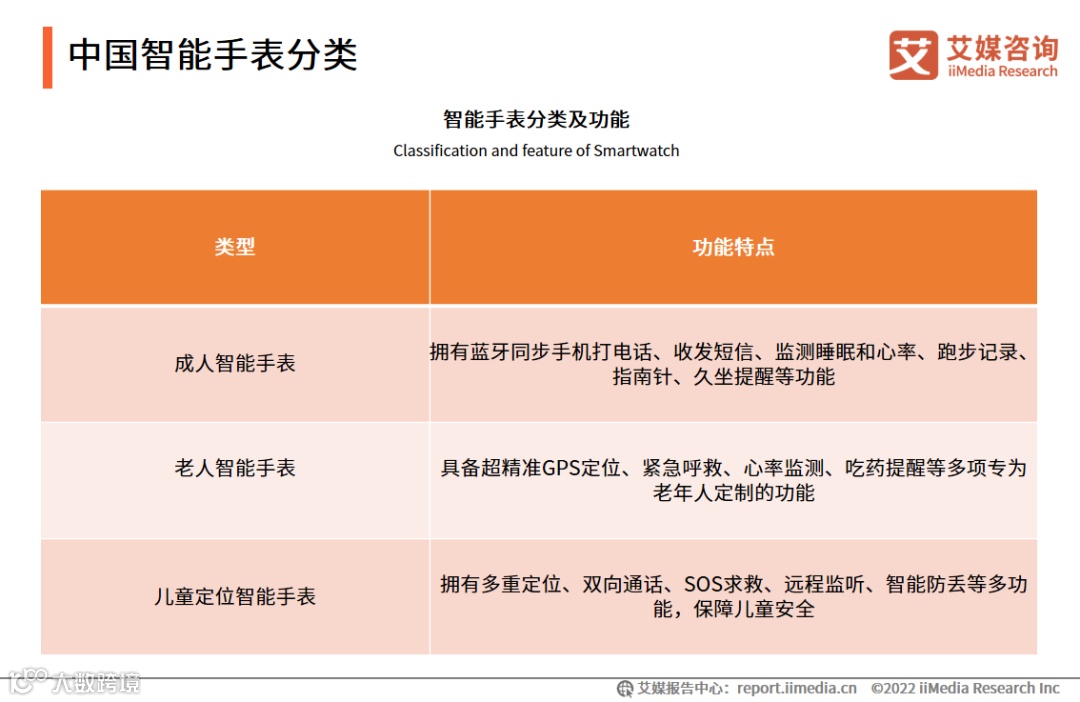 目前,智能手表主要分为成人智能手表、老年人智能手表以及儿童定位智能手表。从功能上看,成人智能手表更偏向于日常生活、工作以及健康运动;老人智能手表倾向于关注老年人健康;儿童定位智能手表更多的是保障儿童安全。