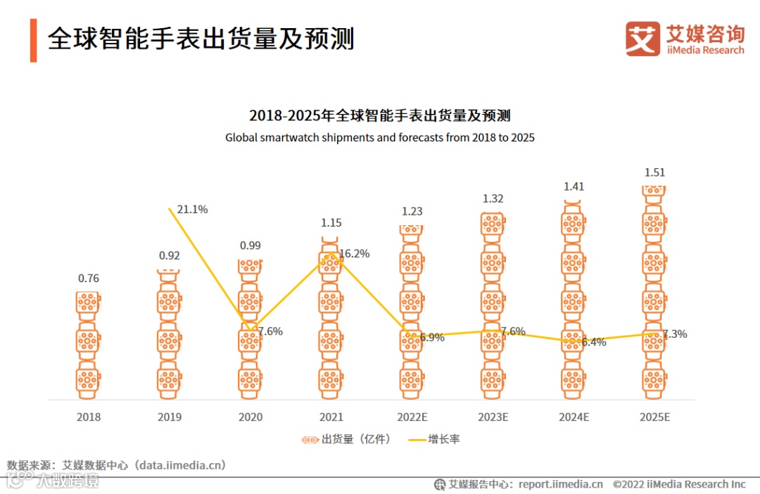 数据显示,2021年全球智能手表出货量为1.15亿件,预计2022年达1.23亿件。在智能可穿戴设备行业,智能手表仍有很大的发展空间和广阔的开发领域。