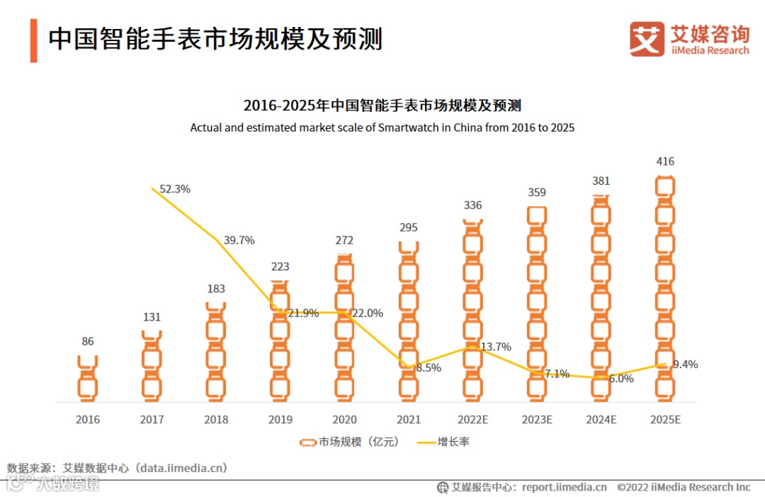 近年来,中国智能手表市场规模呈逐年稳步上升态势。数据显示,2021年中国智能手表市场规模为295亿元,预计2025年超过400亿元。