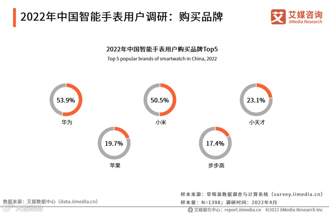 iiMedia Research(艾媒咨询)数据显示,有53.9%的受访用户会选择购买华为的智能手表;其次,会购买小米的智能手表的受访用户占比50.5%。