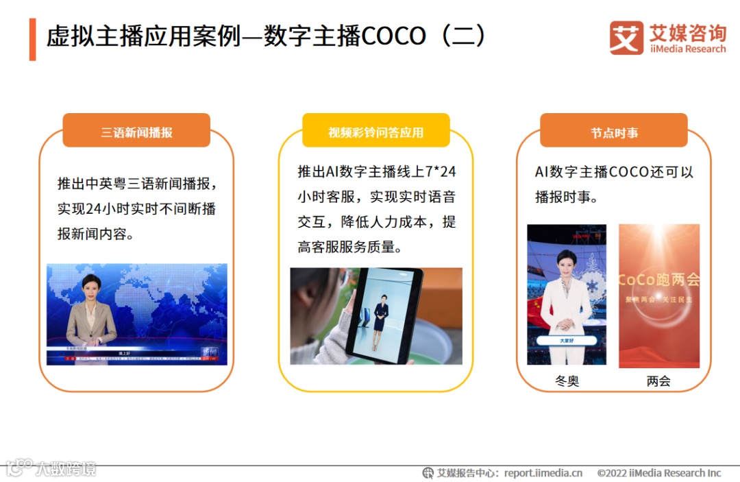 虚拟主播COCO能够实现全场景应用。在新闻播报方面,COCO能够使用中英粤三语进行新闻播报;在视频彩铃问答应用方面,COCO能够担任全时段在线客服,实现实时语音交互,提高客服服务质量。
