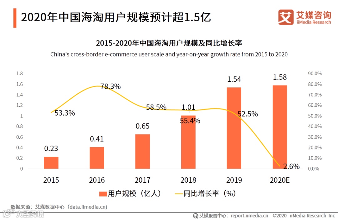 iiMedia Research (艾媒咨询)数据显示,2015年到2019年,中国海淘用户规模持续增长。2019年中国海淘用户规模达到1.54亿人,同比增长率为52.5%。艾媒咨询分析师认为,受疫情影响,2020年海淘市场增长有所放缓。但随着政策的不断加码,技术逐渐提升,海淘需求仍有待进一步挖掘。