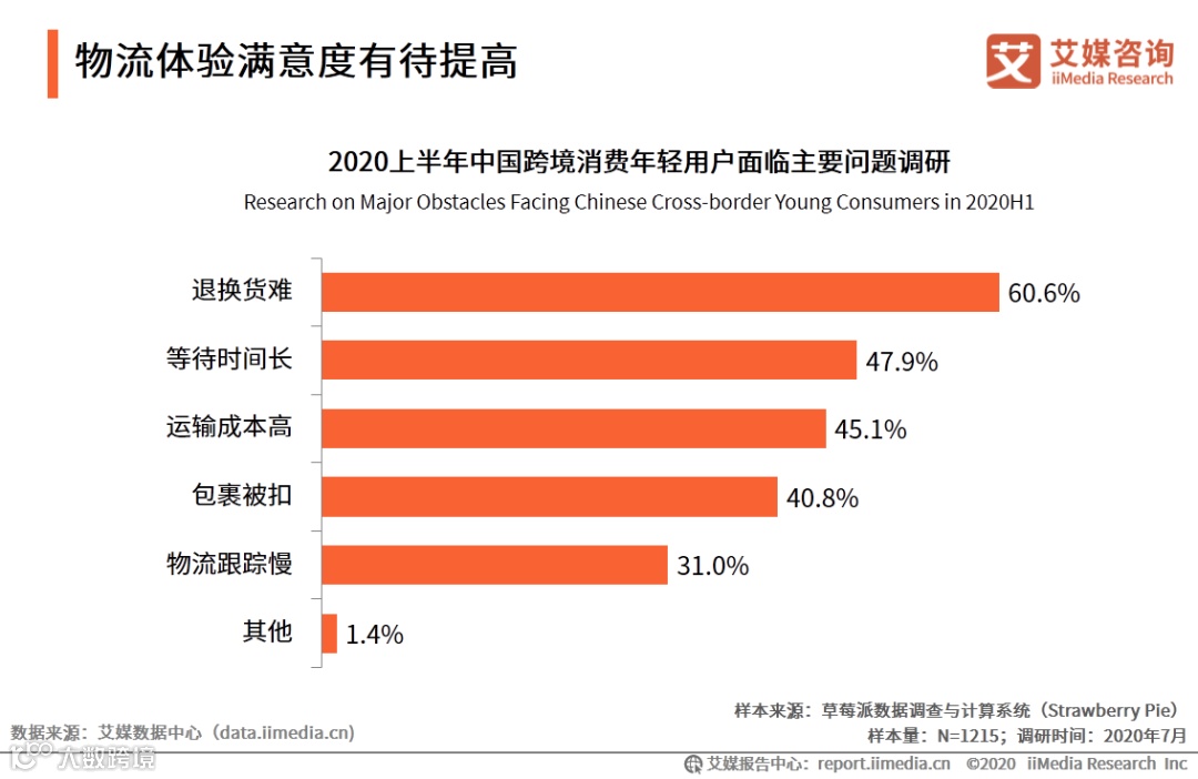 iiMedia Research(艾媒咨询)数据显示,退换货难、等待时间长和运输成本高成为2020上半年中国跨境消费年轻人群面临主要问题。艾媒咨询分析师认为,跨境电商因其独特的物流体系,对平台服务商提出更高的要求。平台应持续提升供应链建设力度,为用户打造更完善的跨境购物体验。