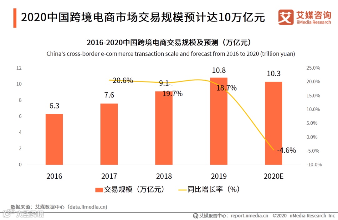 iiMedia Research(艾媒咨询)数据显示,2016-2019年,中国跨境电商交易规模增长放缓,但仍保持在15%以上,增速依然显著。到2020年,受疫情影响,整体跨境电商交易在商品端、物流端等方面都受到较大影响,预计2020年底中国跨境电商交易规模将达到10.3万亿元。艾媒咨询分析师认为,虽然受到疫情影响,但在国外新型市场崛起,国内政策加持以及电商平台的自我建设下,将不断推动着中国跨境电商交易规模向好发展。