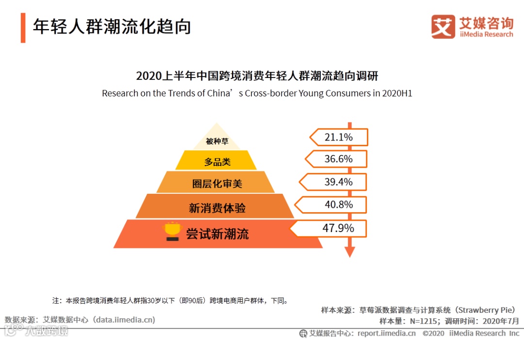 iiMedia Research(艾媒咨询)数据显示,2020年上半年,对于跨境消费年轻人群来说,热衷新潮流、尝试新的消费体验成为其进行跨境消费的主要原因,体现其在跨境消费中喜爱新鲜事物的价值观和潮流趋向。