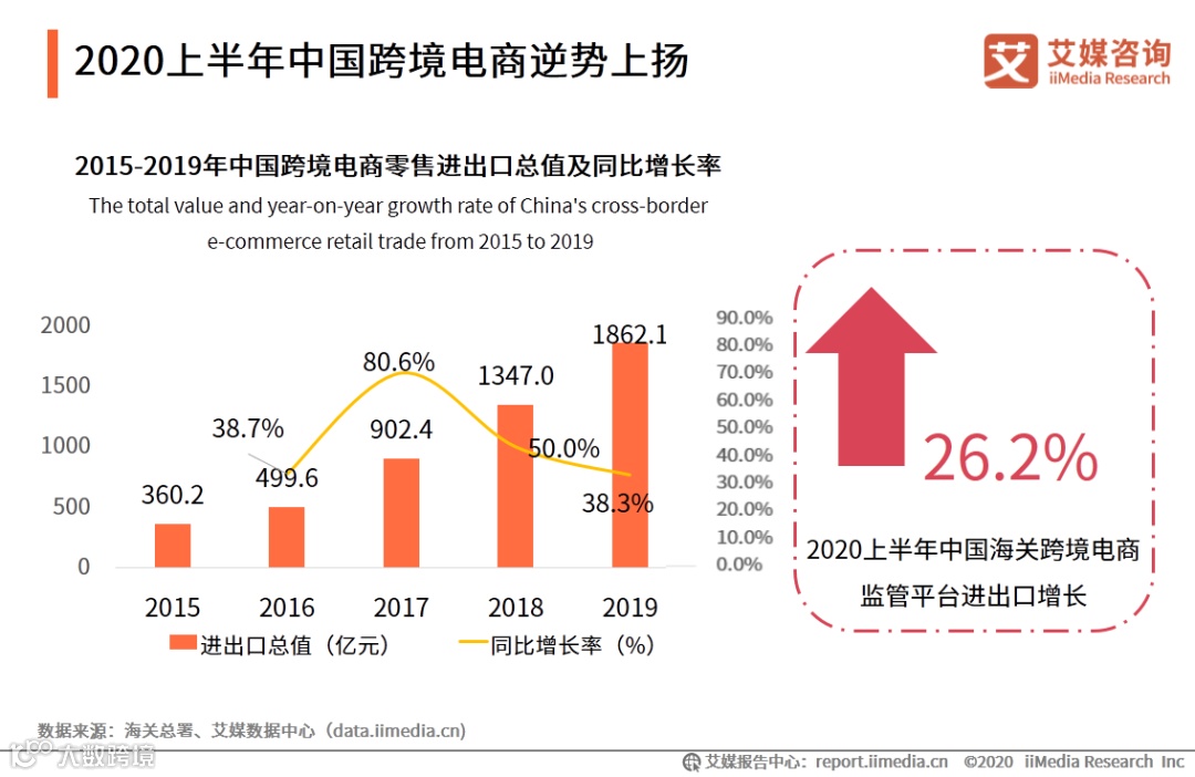 数据显示,2019年中国跨境电商零售进出口总值达到1800亿人民币,同比增长38.3%,2020上半年中国通过海关跨境电商管理平台进出口增长26.2%。跨境电商进出口保持高速增长,主要在于欧美等主要市场的消费格局转变以及一系列利于跨境电商发展的政策落地。