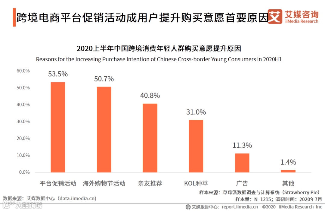 iiMedia Research(艾媒咨询)数据显示,2020年上半年时期,跨境电商平台的促销活动成为用户提升购买意愿最主要的原因,此外,海外购物节活动和亲友推荐也是主要原因。艾媒咨询分析师认为,活动节点消费已经成为年轻用户最大的消费推动因素,各平台也应该不断顺应用户需求,不断完善节日促销主题布局,提升市场竞争力。