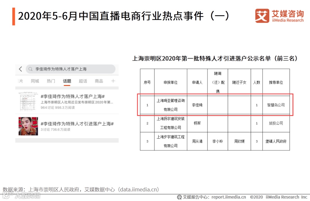 2020年上海市崇明区第一批特殊人才引进落户公示名单中李佳琦在列,且李佳琦将作为特殊人才引进。艾媒咨询分析师认为,虽然对于李佳琦落户上海部分网友存在争议,但其符合上海市崇明区的特殊人才引进标准的第十一条,即其他紧缺急需、确有特殊才能的人才。李佳琦的成功落户也反映出近期各城市相继出台的直播电商扶持政策对相关人才的迫切需求。