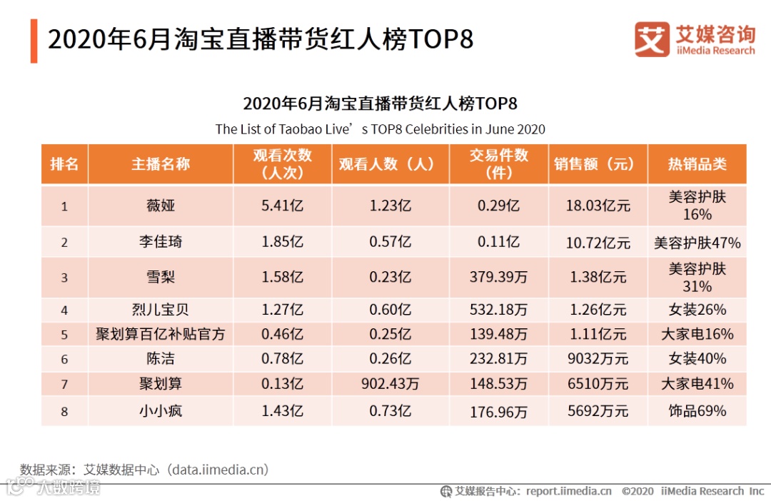 2020年6月淘宝直播带货红人榜TOP8