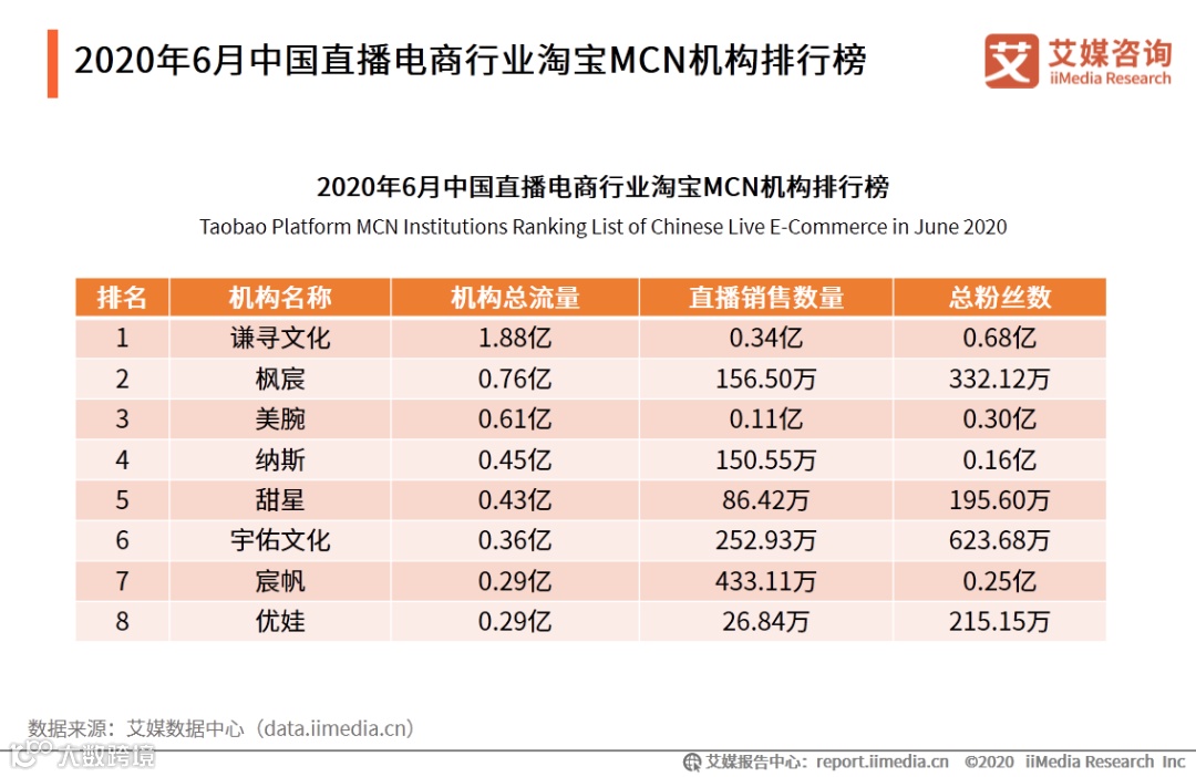 2020年6月中国直播电商行业淘宝MCN机构排行榜的前三名分别是谦寻文化、枫宸和美腕,其中谦寻文化总流量1.88亿远远领先于其他机构。艾媒咨询分析师认为,谦寻文化旗下除了头部主播薇娅,还签约了明星红人和一些当红主播,同时加强供应链建设提高团队直播产品质量,进一步带动了机构在行业的影响力。