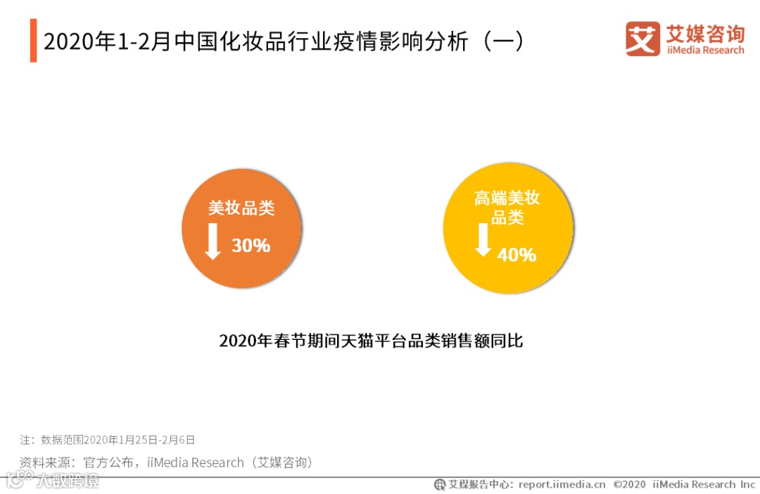 2020年1-2月,化妆品行业整体业绩有所下滑。天猫美妆品类在2020年春节正月期间的销售额与2019年同期相比,整体下降了30%;其中,高端美妆品类所受影响较大,降幅达40%。