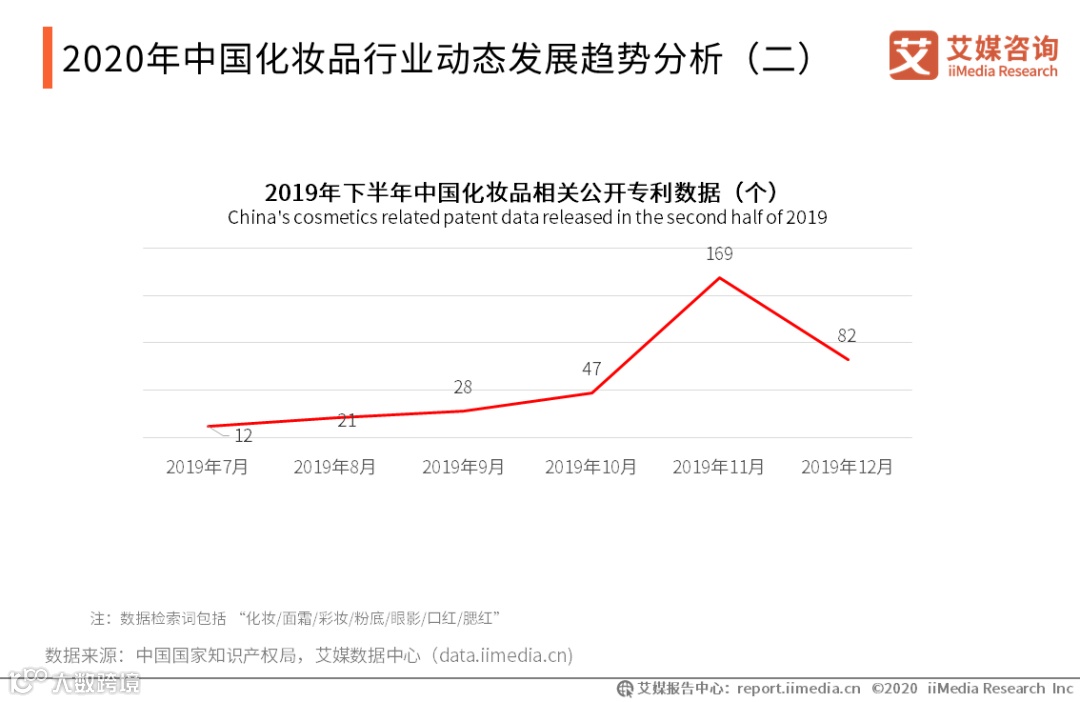 从公开专利数据来看,2019下半年中国化妆品相关中国的专利公开数大幅上扬。艾媒咨询分析师认为,长期以来中国化妆品产品都面临着外国品牌竞争,而受到自主知识产权核心技术等限制,中国的化妆品产品大多为大众消费品而无法跻身高端化妆品行列。因此,在中国化妆品行业一系列相关政策法规的落地推动下,中国化妆品行业将进一步迈向高端化的发展路径。
