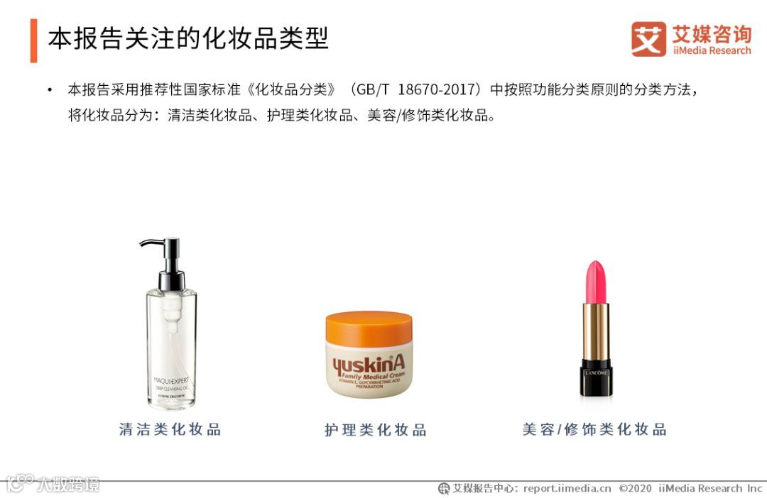 本报告采用推荐性国家标准《化妆品分类》(GB/T 18670-2017)中按照功能分类原则的分类方法,将化妆品分为:清洁类化妆品、护理类化妆品、美容/修饰类化妆品。