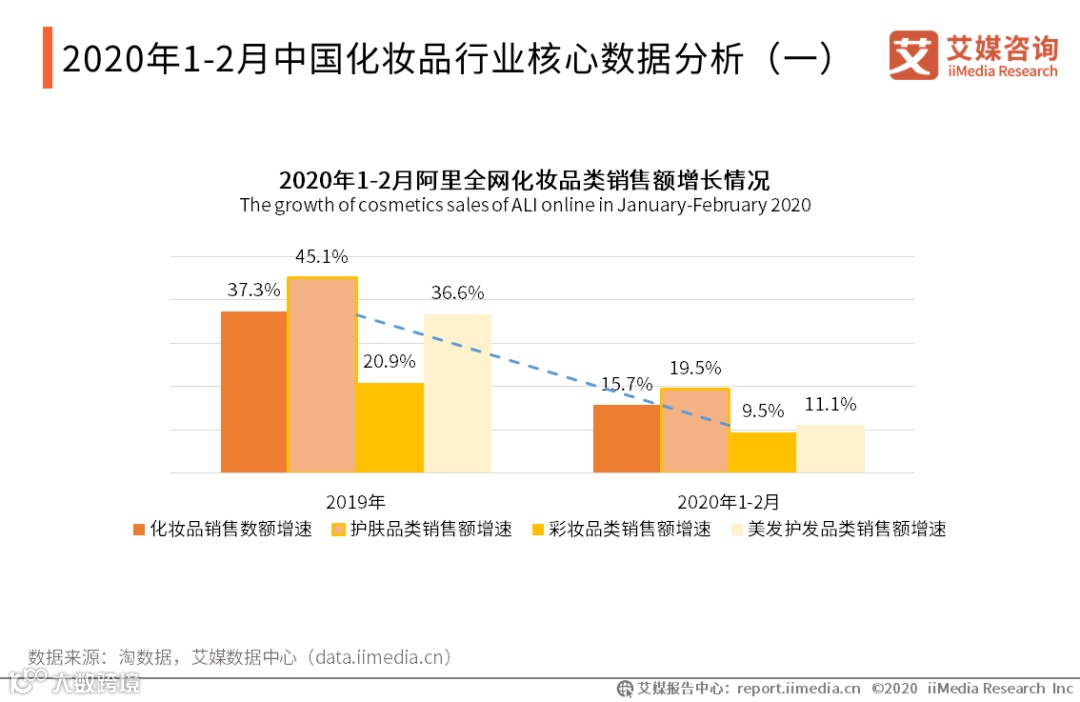 从2020年1-2月阿里全网化妆品类销售数据增长情况可以看到,2020年各品类的销售额相比于2019年全年增速均有所放缓,其中,2020年1-2月阿里全网化妆品销售额增速较2019年全年增速放缓了21.6%。艾媒咨询分析师认为,疫情导致民众出行比例大幅降低,大部分快递商延期开工,以及居民社交性化妆品需求的减少等,都是导致化妆品行业在疫情期间增速有所趋缓的原因。
