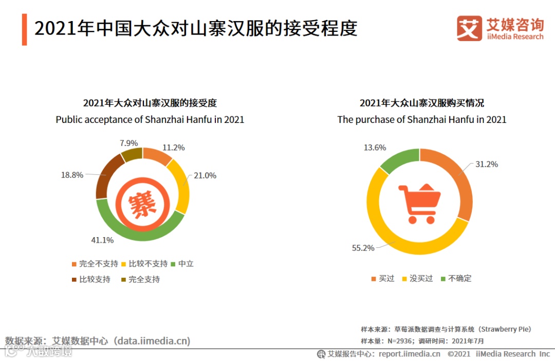 iiMedia Research(艾媒咨询)调研数据显示,超四成的受访消费者表示对山寨持中立态度,仅有11.2%表示完全不支持,此外有31.2%的人表示自己有购买过山寨汉服。艾媒咨询分析师认为,当前普通消费者对山寨汉服抵制程度仍然不足,注重原创和版权意识培养任重道远。