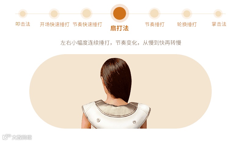 精选10种按摩模式,扇打法,左右小幅度连续捶打,节奏变化,从慢到快再转慢。
