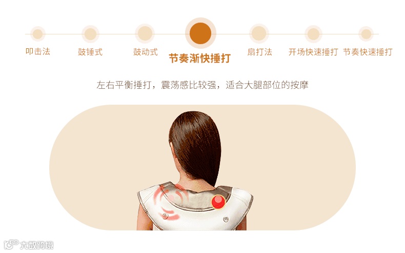 节奏渐快捶打,左右平衡捶打,震荡感比较强,适合大腿部位的按摩。