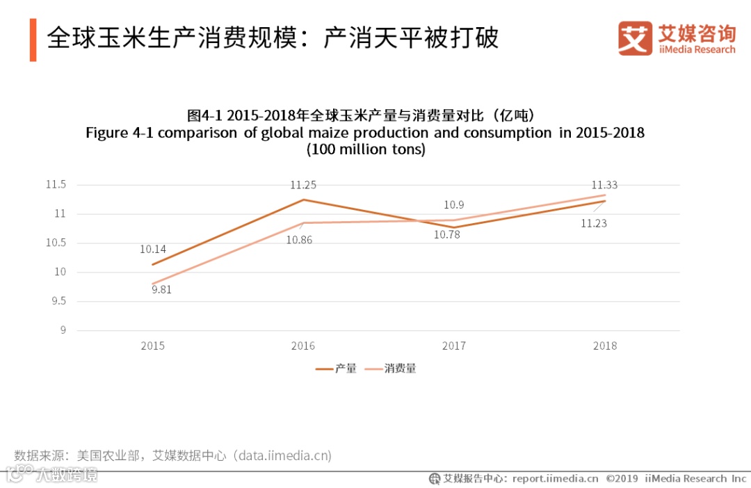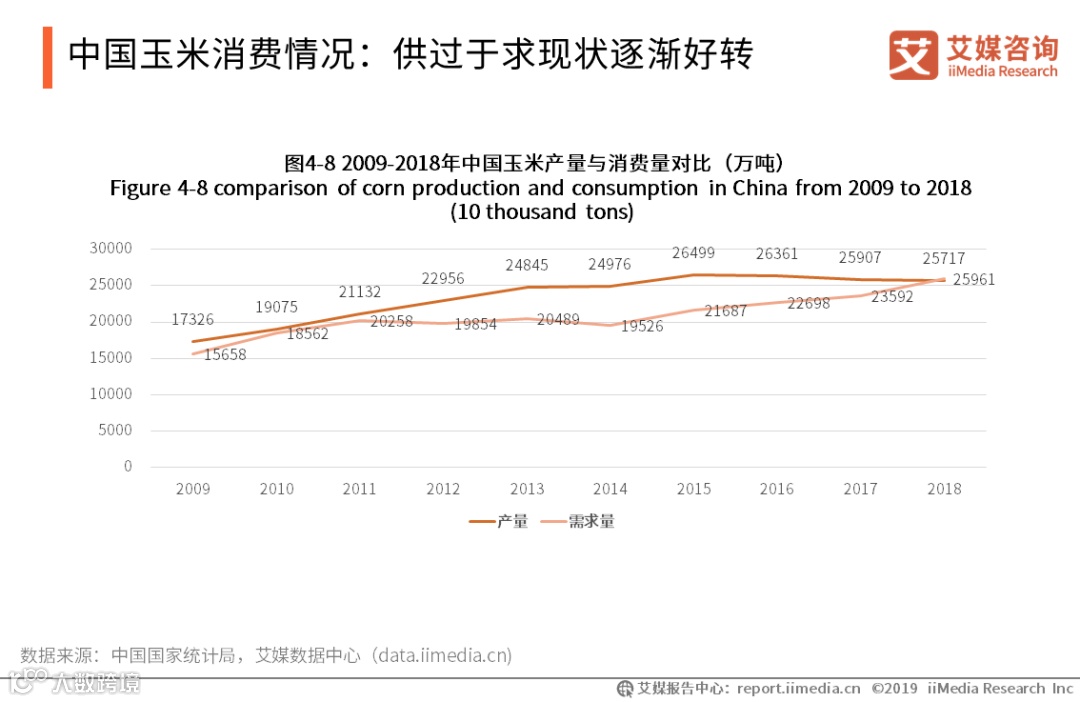过去10年中国玉米供过于求状况十分明显,自2015年底,农业部发布《关于“镰刀弯”地区玉米结构调整的指导意见》以来,玉米产量持续下滑,总需求量明显回升。数据显示:2018年玉米产量首次高于需求量,中国市场供过于求现象得到扭转。