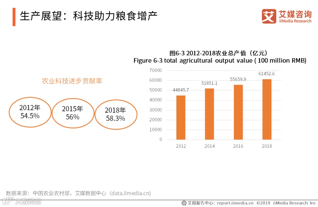 2018年中国农业科技进步贡献率达到58.3%,良种实现全覆盖,旱涝保收、高产稳产的高标准农田达到6.4亿亩,粮食作物耕种收综合机械化率已经超过80%。我国农业进入主要依靠科技装备驱动的新阶段,科技助力粮食增产。