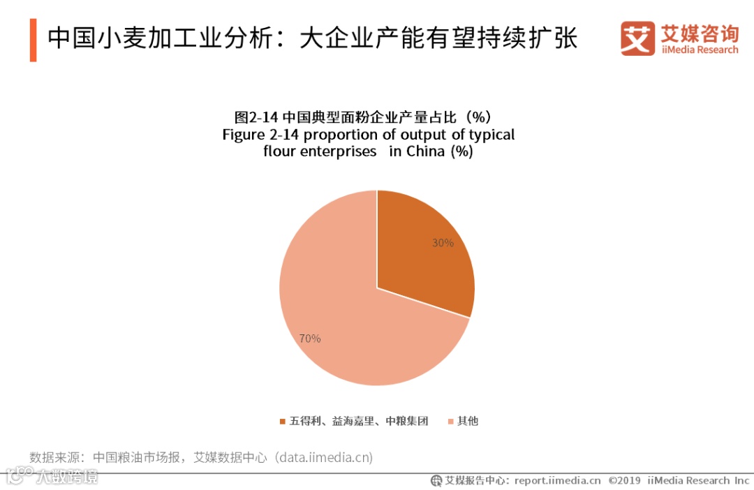 近年来,中国面粉加工行业整合加速进行,大型面粉企业持续扩张产能,国内现已形成具有相当规模的生产体系。目前,中国国内面粉加工行业三大巨头五得利面粉集团、益海嘉里面粉集团以及中粮集团面粉产量约占全国的30%。可以预计的是,利用企业现有的资源及整合能力,这三大巨头未来产能仍将进一步扩大。