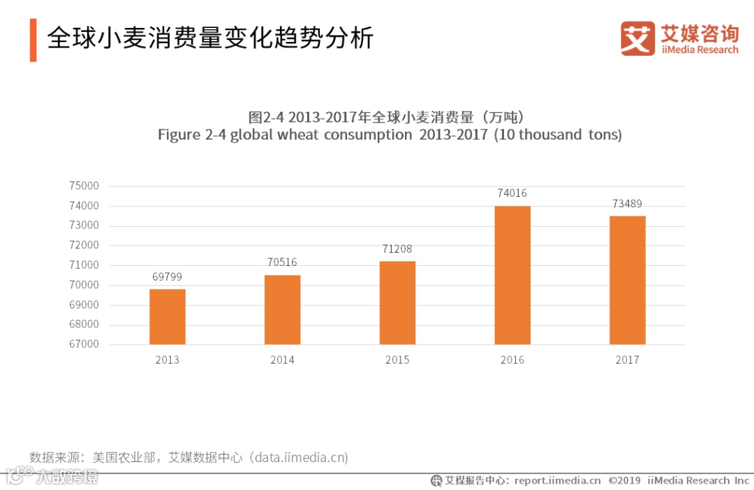 2012到2016年全球小麦消费量呈现逐年上升趋势,2016年达到74016万吨,年均复合增长率为2.2%,2017年小麦消费量有所减少。艾媒咨询分析师认为,欧美国家降雨过量,影响到小麦作物。尤其是法国和加拿大,2017年连续性的降雨导致麦田虫害增多,从而导致小麦产量减少,进而影响消费量减少。