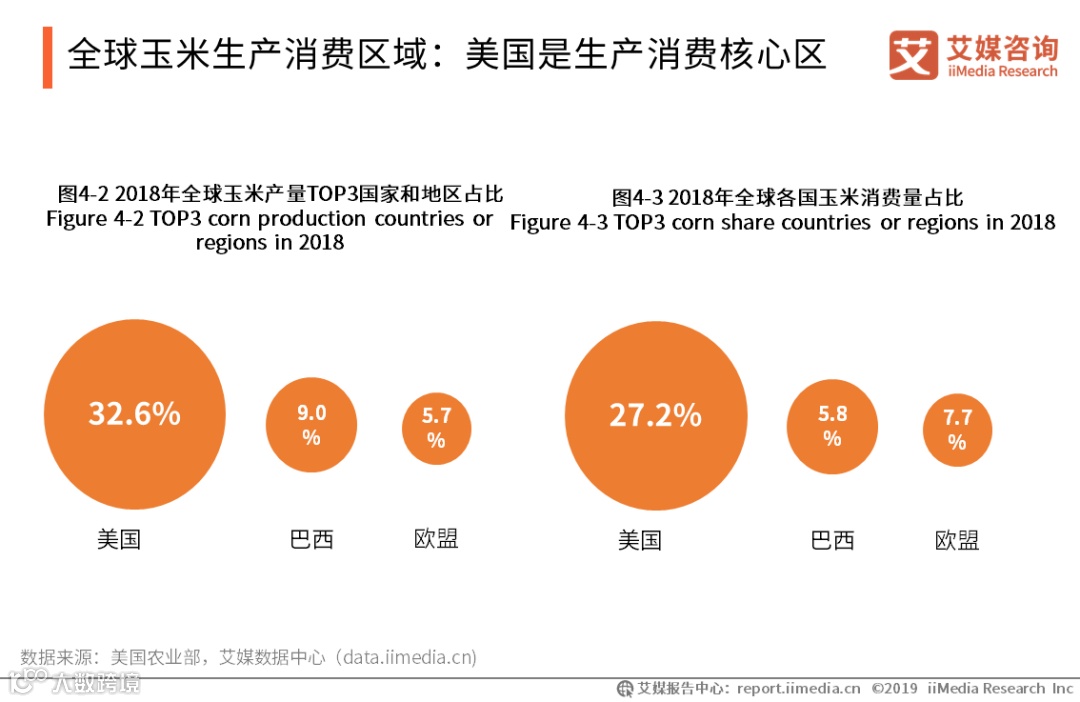 从产量分布上看,2018年美国玉米产量占全球总产量的32.6%,巴西占全球的9.0%,欧盟占5.7%,为全球玉米产量前三的国家和地区。从消费量格局看,2018年美国玉米消费量占全球整体消费量的27.2%,巴西玉米消费量占5.8%,欧盟消费量占7.7%。对比而言,玉米主要生产国和消费国具有一定的一致性。