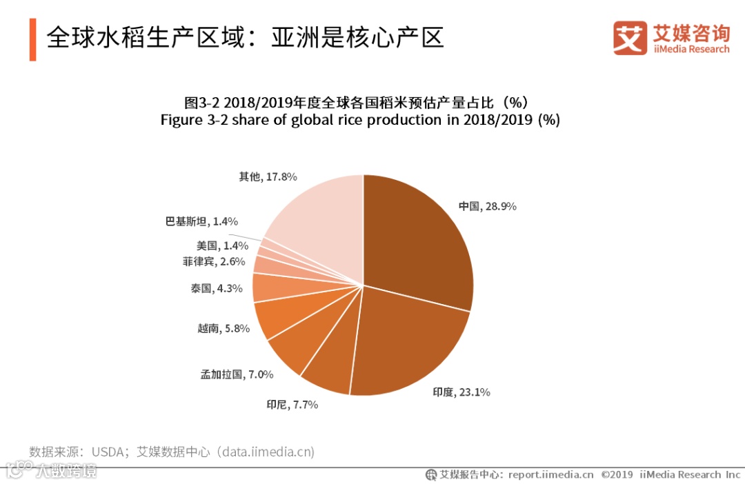 世界水稻绝大部分分布在东亚、东南亚、南亚的季风区,东南亚的热带雨林区。中国是全球最大的大米生产国,年产量连续多年排名第一。2018/19年度,中国大米产量预计占全球产量的28.9%。产量排名第二的是印度,印度的大部分农业都是基础的传统农业,现代化程度不高,但是印度有过半的人都是以农业为生,同时印度是世界第二人口大国,仅次于中国,印度的大米产量占全球约23.1%的比重。
