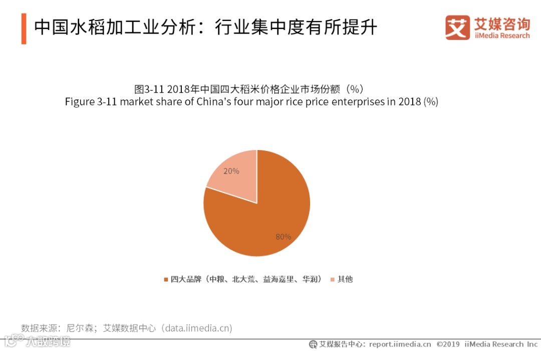 部分水稻加工企业的关停给了龙头企业扩大市场份额的契机,使得行业集中度有所提升。2018年,中国四大稻米加工企业市场份额共占80%,小企业的生存空间越发拥挤。艾媒咨询分析师认为,行业集中度的上升可加快稻米加工业转型升级的步伐。