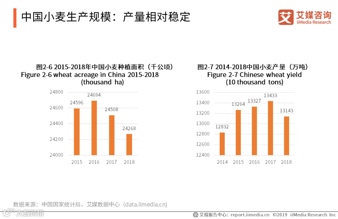中国是全球最大的小麦生产国和消费国,小麦的种植面虽然存在波动,但波动曲线比较合理。2018年,中国小麦播种面积24268千公顷,产量13143万吨。艾媒咨询分析师认为,受农业用地面积减少的影响,预计未来中国小麦的种植面积不会有大规模的提升,在耕种面积不提升的前提下实现增产是未来小麦的发展方向。