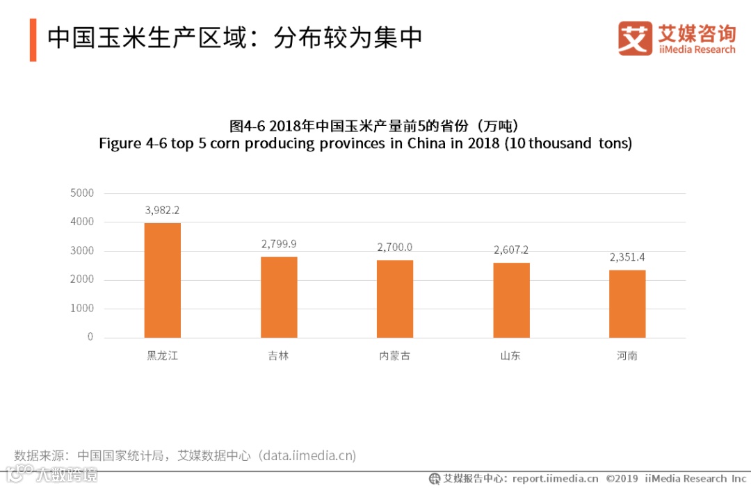 中国是世界上第二大玉米生产国和消费国,境内玉米布局较为集中,主要集中在东北华北地区。2018年,中国玉米总产量为25717.4万吨,其中排名前5的省份有4个位于东北和华北地区,分别是黑龙江、吉林、内蒙古、山东、河南。五省总产量为14440.7万吨,占全国玉米总产量的56%。