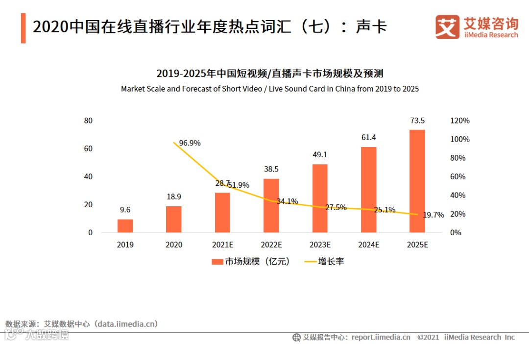 2020年直播行业的火热带动了音频硬件市场的发展。其中,短视频/直播声卡设备的应用范围广泛,除了直播与短视频制作之外,也可用于K歌、视频配音、线上教育、有声书录制等,功能包括场景音效、特色互动特效、变音功能与外接伴奏,主要应用群体包括公会/MCN、专业主播、中小商户和个人用户。iiMedia Research(艾媒咨询)数据显示,2020年中国短视频/直播声卡市场规模达18.9亿元,同比2019年增长96.9%,呈井喷式增长。预计中国短视频/直播音频硬件市场规模将超100亿元,而短视频/直播声卡市场规模可达73.5亿元。