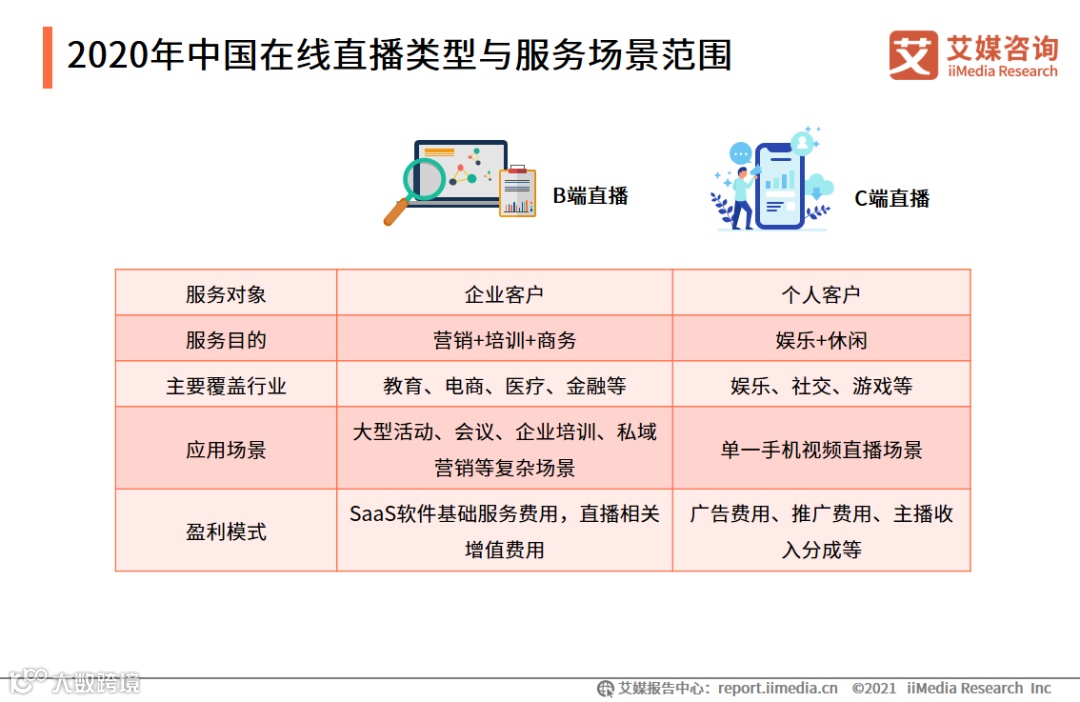 目前在线直播类型主要分为B端直播与C端直播。B端直播具有商务性,主要应用于培训及承办大型商务活动,对直播技术与设备的专业性要求更高,C端直播更具休闲娱乐特征,应用场景单一,覆盖行业更加泛娱乐化。
