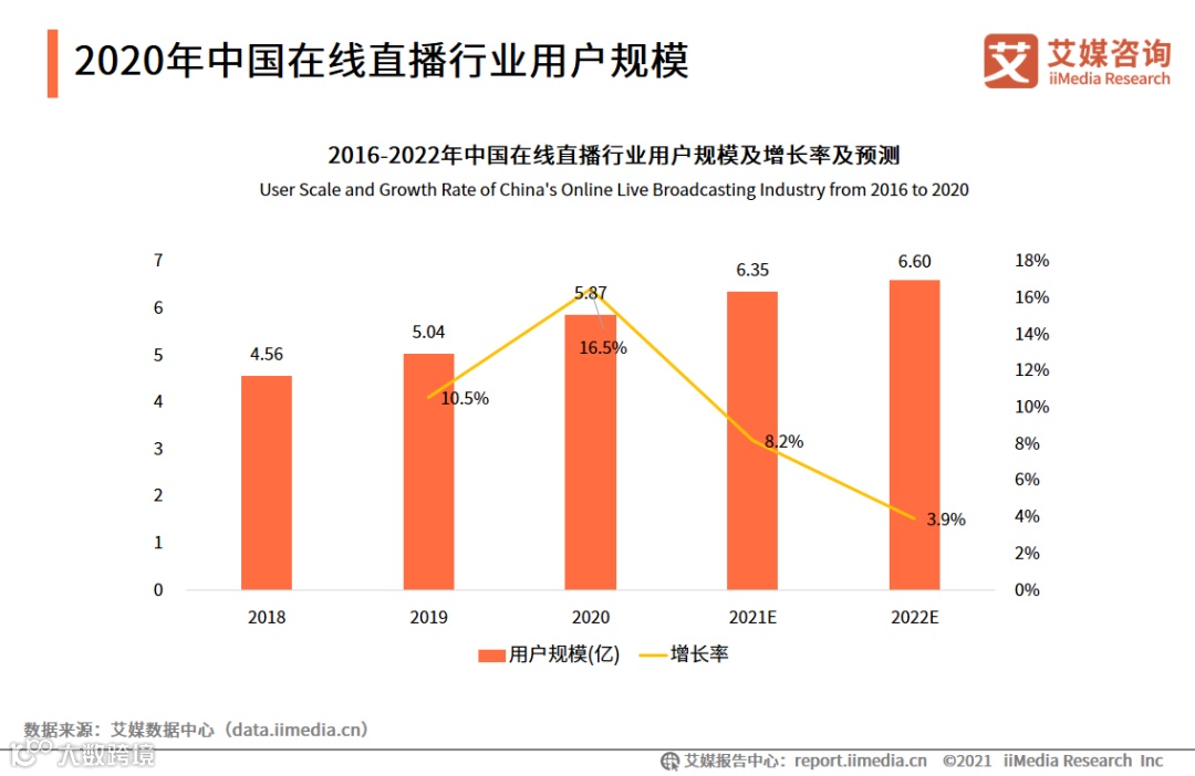 图表2:2016-2022年中国在线直播行业用户规模及增长率及预测
