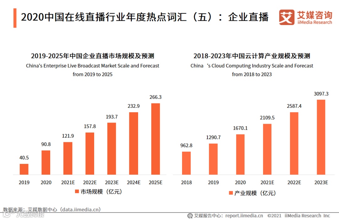 疫情期间,企业积极开展线上业务,企业直播规模迅速增长。iiMedia Research(艾媒咨询)数据显示,2020年中国企业直播市场规模达90.8亿元,B端用户超过120万家,预计2025年中国企业直播市场规模将达到266.3亿元,用户将超过270万。企业直播也带动了云计算行业的发展, 2020年中国云计算产业规模达到1670.1亿元。随着企业级直播厂商的垂直化深耕,未来较长一段时间内企业级直播都将保持高速增长态势。