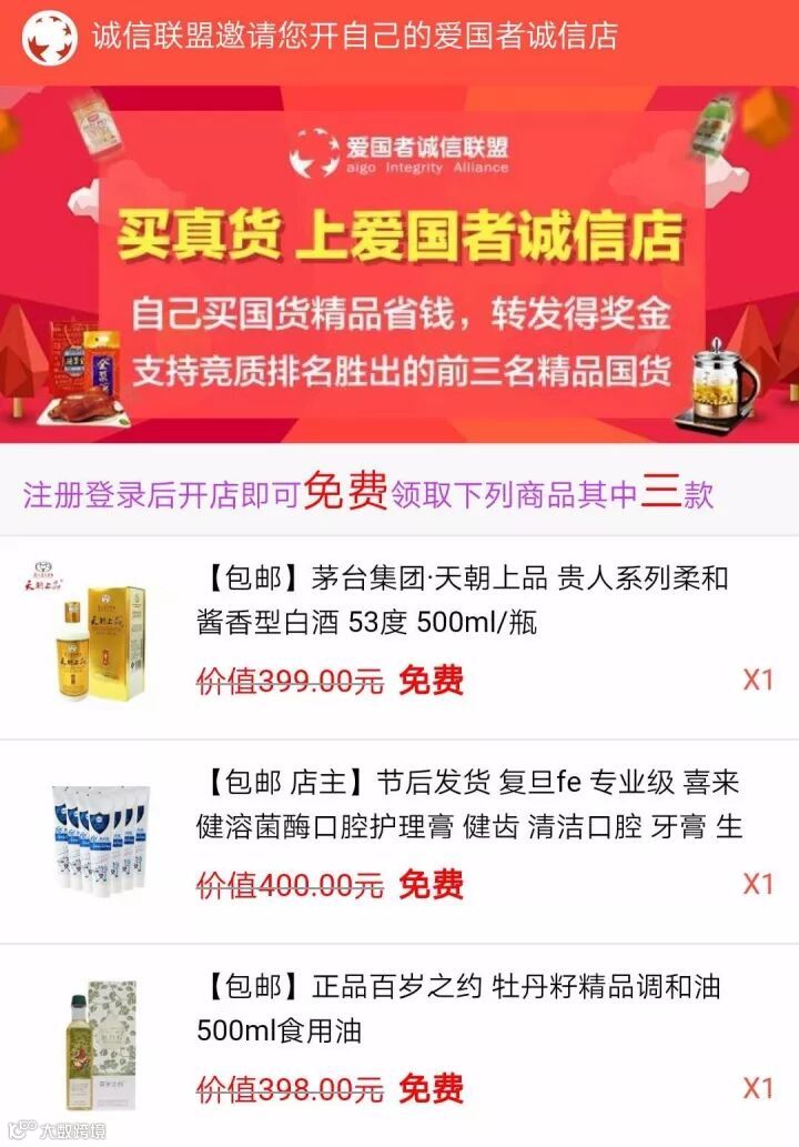 想要拥有自己的爱国者诚信店,需要支付365元开店费,就可以成为爱国者诚信店店主。同时,开店就可以获赠超值奖品,六选三。