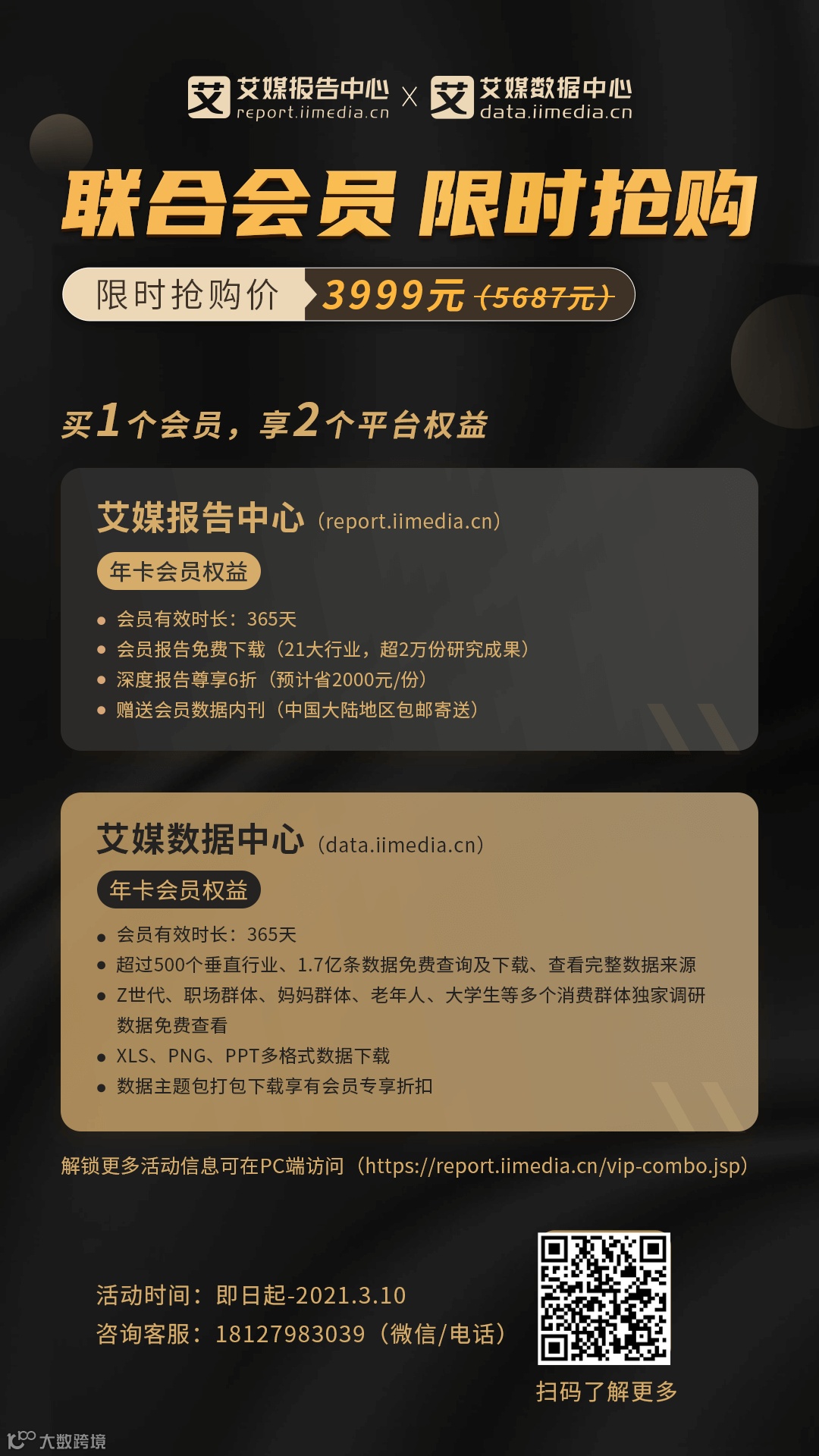 为了帮助企业更好地了解行业及用户,打好2021的每一场“硬仗”,艾媒咨询最新推出报告库&数据库“联合会员”活动,畅享海量行业数据及报告资源,一个会员就够了!