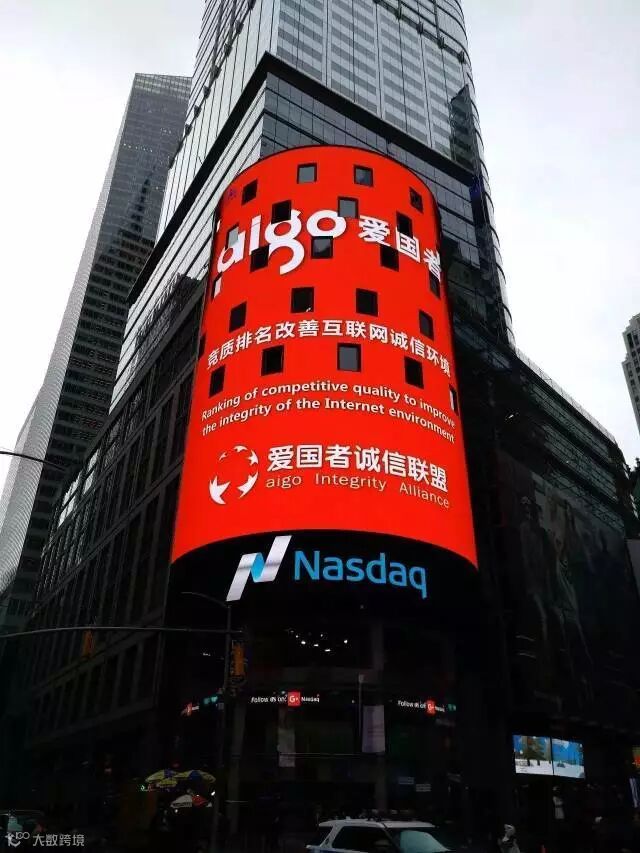 2016年12月26日,爱国者诚信联盟登上纽约时代广场纳斯达克大屏!爱国者诚信联盟的竞质排名出现在纽约时代广场纳斯达克大屏,为竞质排名胜出的国货精品抱团走向世界做了先期准备和铺垫,也成为爱国者诚信联盟挂牌上市全球路演的开始!