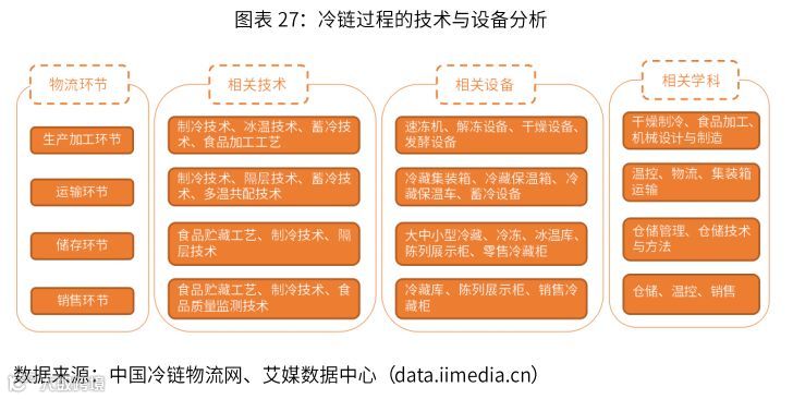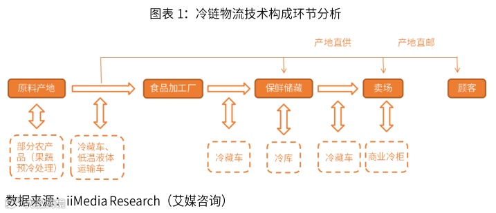 冷链物流由预冷处理、冷链加工、冷链储存、冷链运输和配送及冷链销售几方面构成,涉及冷库、冷藏车、保温盒、冷藏陈列柜等设施。